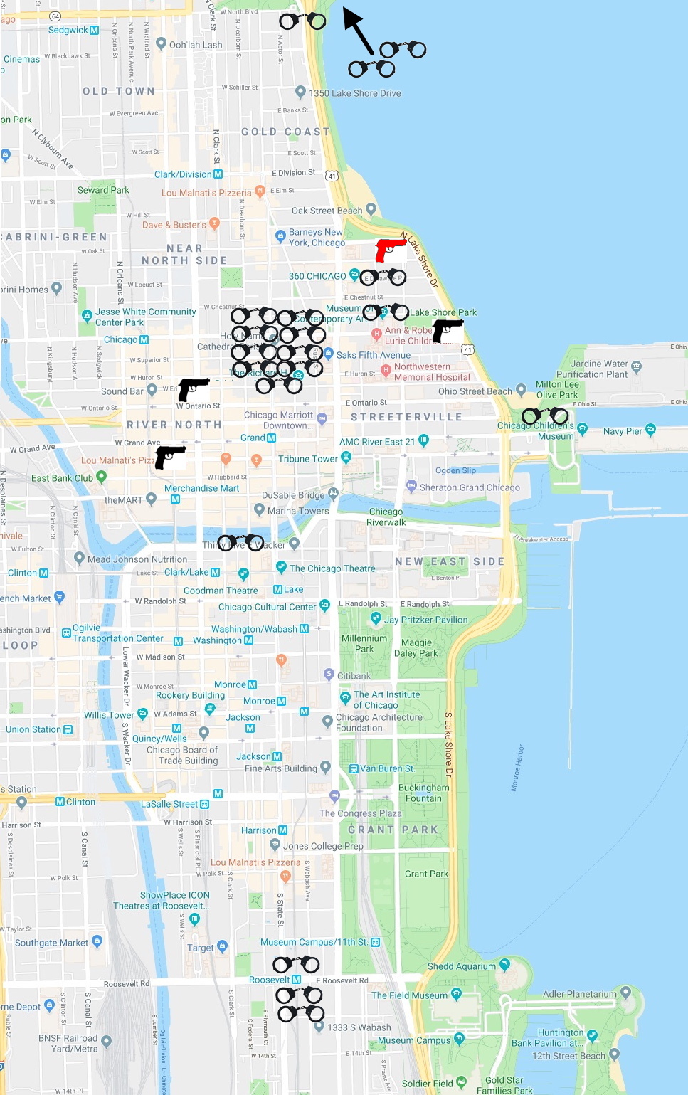 Our team has identified four confirmed cases of shots fired in the Near North area this weekend—in the 500 block of North Wells; at LaSalle and Erie, and in the 800 block of North Lake Shore Drive. Police are still working to determine exactly where the fourth incident occurred. In a low-water mark, an on-duty undercover cop lost his phone to a pickpocket on Michigan Avenue Sunday.